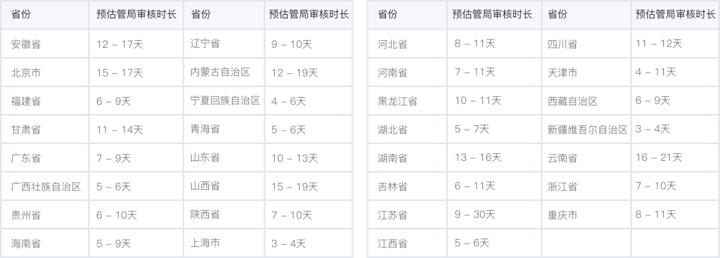 各個省管局預(yù)計審核時長,實際審核時長會根據(jù)備案場景有所不同,下表格僅供參考。詳情可查看 詳細(xì)規(guī)則。